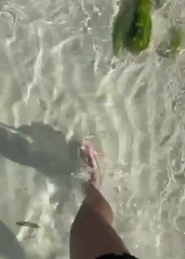 The video opens with a person's legs and feet walking in clear shallow water over white sand