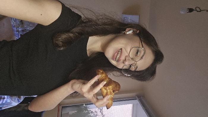 The image depicts a young adult female positioned indoors in Stara Zagora, Bulgaria. She is facing the camera with a smile, displaying orthodontic braces on her upper teeth. Her long, dark brown hair frames her face. She wears gold-rimmed eyeglasses and a white wireless earbud in her left ear, along with a small gold hoop earring. Her attire consists of a plain black short-sleeved top. In her right hand, she holds a golden-brown croissant. A small dark lesion, consistent with a mole or freckle, is visible on her upper right arm. The indoor environment includes a light-colored ceiling with a visible hanging light fixture (exposed bulb) in the upper left. A white wall-mounted air conditioning unit is present on the upper left wall. A window on the right side of the frame allows natural light into the space and reveals a green plant outside. A table with glassware is partially visible in the lower left corner of the frame, and a blurred light blue and white checkered pattern is present in the lower right background.