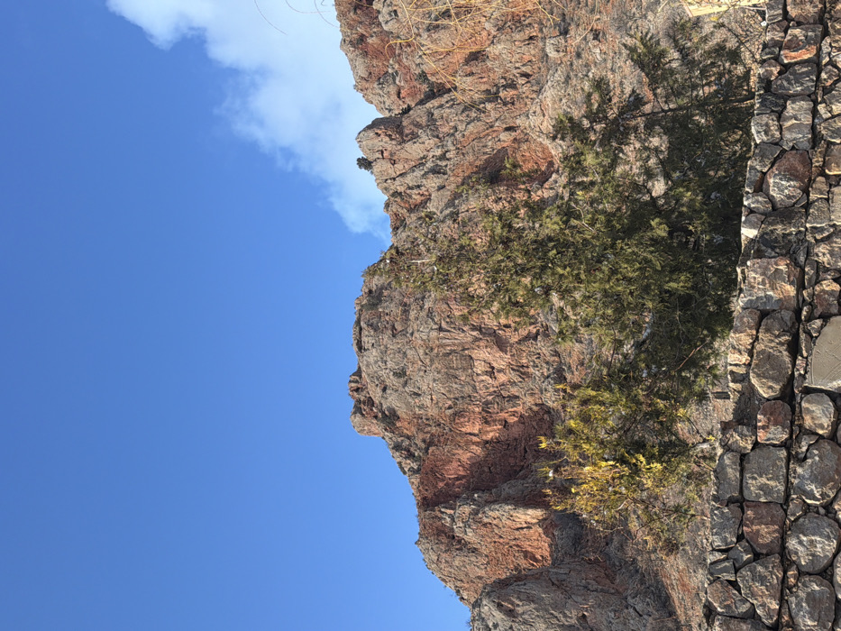 The image displays a mountainous landscape in Areni, Armenia, under a clear, deep blue sky featuring wisps of white clouds on the upper right side. The central and dominant feature is a rugged mountain range characterized by exposed rock formations. These rocks exhibit varied coloration, primarily grey and brown, with significant sections displaying distinct reddish-orange hues. Shadows are visible on parts of the rock faces, suggesting sunlight from the left. Against the lower slopes of the mountain, a prominent dark green conifer-type tree stands in the center-right, flanked by a smaller tree with yellowish-green foliage to its left. Sparse, bare branches are visible on the far right. The immediate foreground is occupied by a low, dry-stacked stone wall, constructed from irregularly shaped grey and brown stones, extending across the entire bottom edge of the frame. No individuals, actions, or interactions are present in the scene.