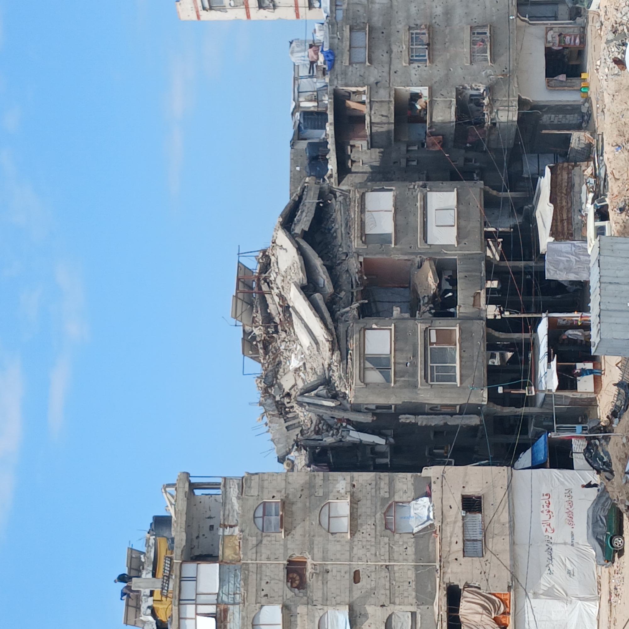 The image depicts a severely damaged building in Gaza, Palestinian Territory. The structure shows extensive destruction, with sections collapsed and debris scattered around. Other buildings in the vicinity show signs of damage as well, including bullet holes and structural weaknesses. There are people visible on rooftops, possibly assessing the damage or engaging in daily activities amidst the destruction. Laundry lines are strung between buildings, indicating continued habitation despite the severe conditions. A large banner is draped over one of the buildings, possibly providing shelter. A vehicle is parked nearby, covered partially by the banner. The overall environment suggests a scene of conflict and devastation.