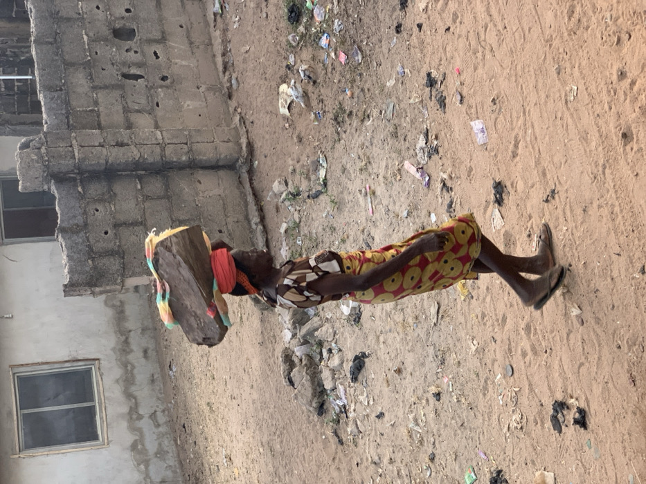 - "An adult female carries a large block wrapped in colorful fabric on her head while walking on sandy ground with scattered trash" by FM-JIEGo1, licensed under CC BY 4.0