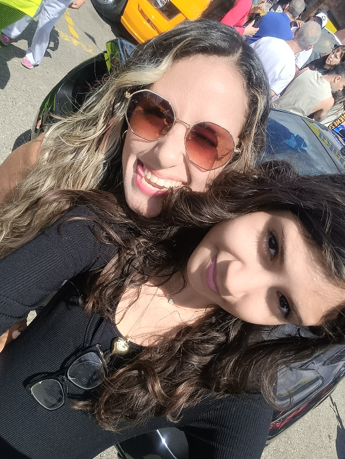 This outdoor photograph, taken in Carrizal, Venezuela, depicts two females in the immediate foreground, positioned for a close-up shot. The female in the upper left has long, wavy brown hair with prominent blonde highlights, is wearing large gold-framed hexagonal sunglasses with reddish-brown lenses, and displays a broad smile with her teeth and tongue visible. She is wearing a dark-colored top. The female in the lower right has long, dark, curly hair, dark eyes, and light pink lipstick, presenting a subtle smile. She is wearing a black ribbed long-sleeved top and a layered gold necklace with heart-shaped pendants; a pair of black-framed eyeglasses rests on her chest. In the blurred background, a crowd of several individuals is visible, suggesting a public gathering or event. A yellow vehicle is partially observable in the upper background, and a reflective black surface, possibly part of another vehicle, is situated to the right of the foreground subjects. The scene is illuminated by bright, direct sunlight.