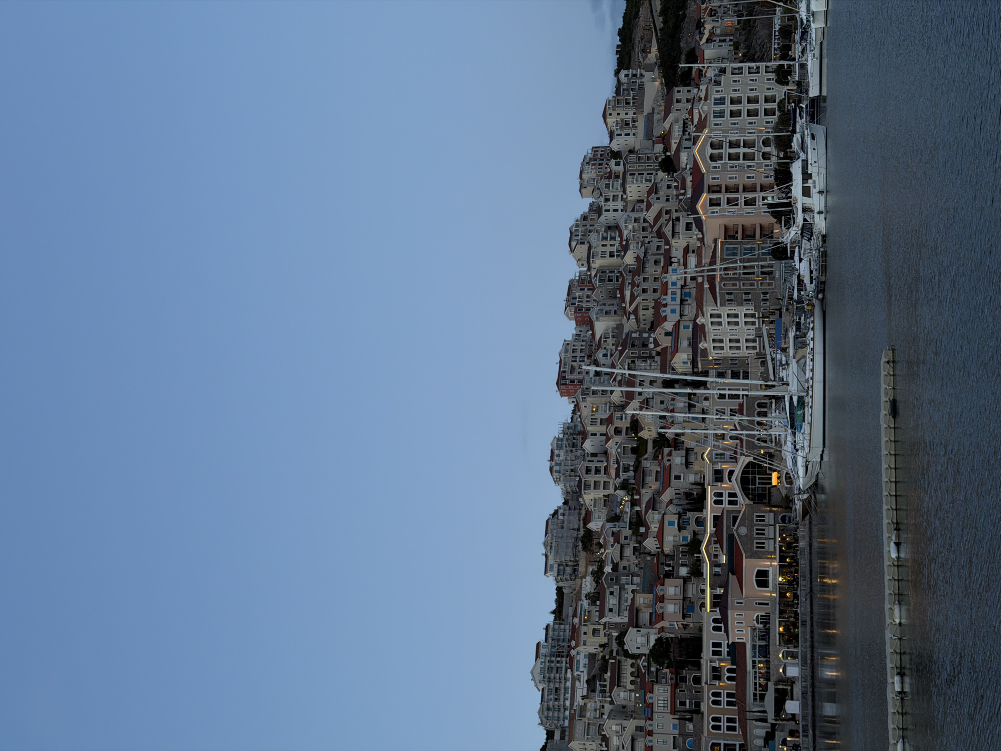 The image captures a coastal scene in Radovići, Montenegro, featuring a densely built residential area along a hillside adjacent to a marina. The architecture consists of multi-story buildings with varied rooflines and window arrangements. Several boats are docked in the marina, with their masts visible among the buildings. The water is calm, reflecting the lights from the buildings. The sky is a pale blue, suggesting either dusk or dawn. A concrete pier or breakwater runs along the edge of the marina.
