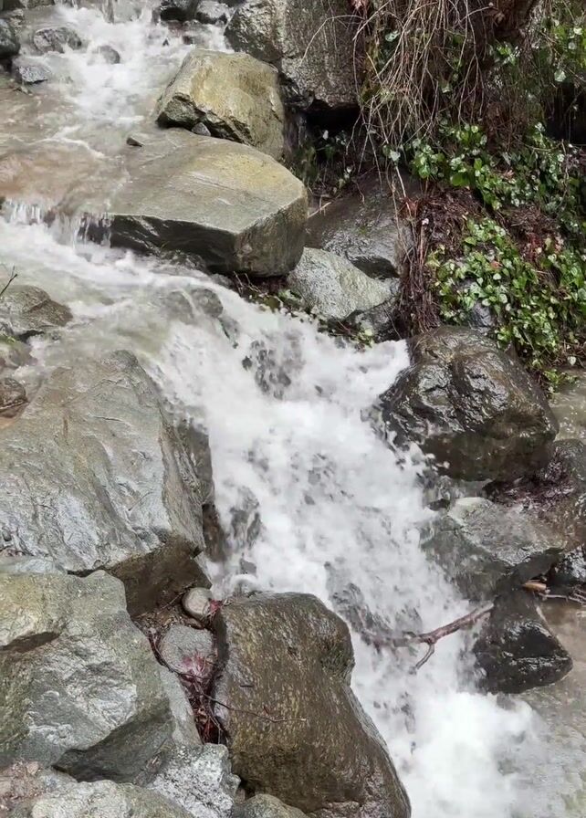 The video depicts a small stream flowing over rocks