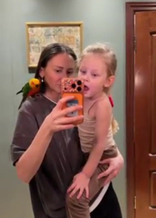 A woman stands holding a young child, presumably her daughter, while taking a selfie in a mirror. A small, colorful parrot is perched on the woman's left shoulder. The woman is wearing a gray T-shirt and black leggings. The child is wearing a tan tank top and brown leggings, with a small red hair tie in her blonde hair. They are in a room with pale green walls and a wooden door. A framed piece of artwork hangs on the wall behind them. The child sticks her tongue out at the camera.