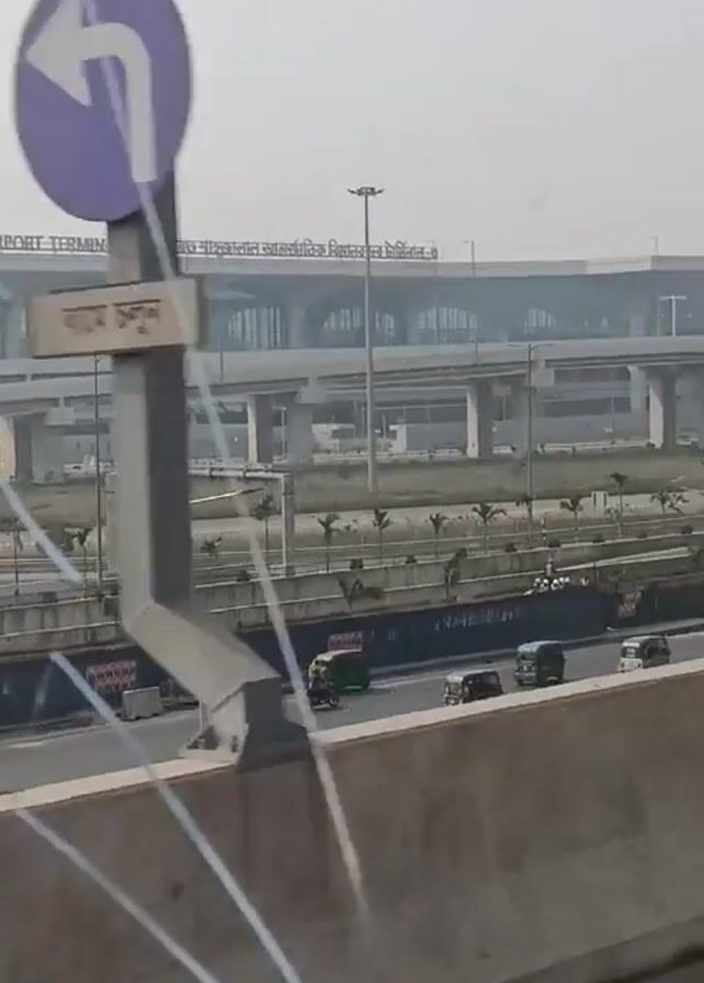 The video presents a view of the Hazrat Shahjalal International Airport Terminal in Dhaka, Bangladesh. The shot is taken from what appears to be inside a vehicle, with cracks visible on the window in the foreground. Below the airport, a highway with moderate traffic can be seen, including cars, motorbikes, and auto-rickshaws. The general environment appears somewhat hazy or smoggy. There isn't much visible human activity immediately surrounding the airport terminal.