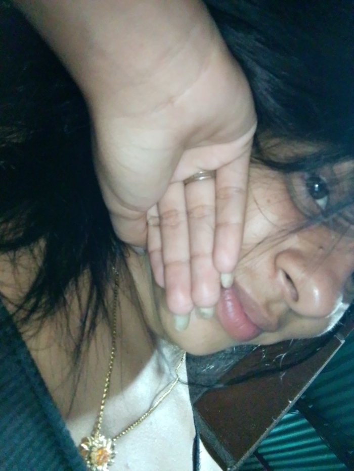 A close-up portrait, angled from the lower left, depicts an individual, likely female, with dark hair cascading over the upper left and right sides of the frame. The subject's right hand is positioned across the lower face, covering the chin and part of the mouth. A plain metal ring is worn on the ring finger of the right hand. The fingernails of the visible fingers are elongated and show signs of dirt or discoloration underneath. The right eye, with a dark iris, is visible and directed towards the viewer. The nose and full lips, slightly parted, are also visible. A gold-colored chain necklace with a circular pendant, featuring a central orange/brown stone, rests on the subject's visible chest/neck area. The subject wears a white undergarment beneath a dark outer layer. The background visible on the lower right is indistinct, showing dark and green-striped or corrugated surfaces. The specific location in the city of Juan Griego, Venezuela, cannot be determined from the visual evidence presented in the image.