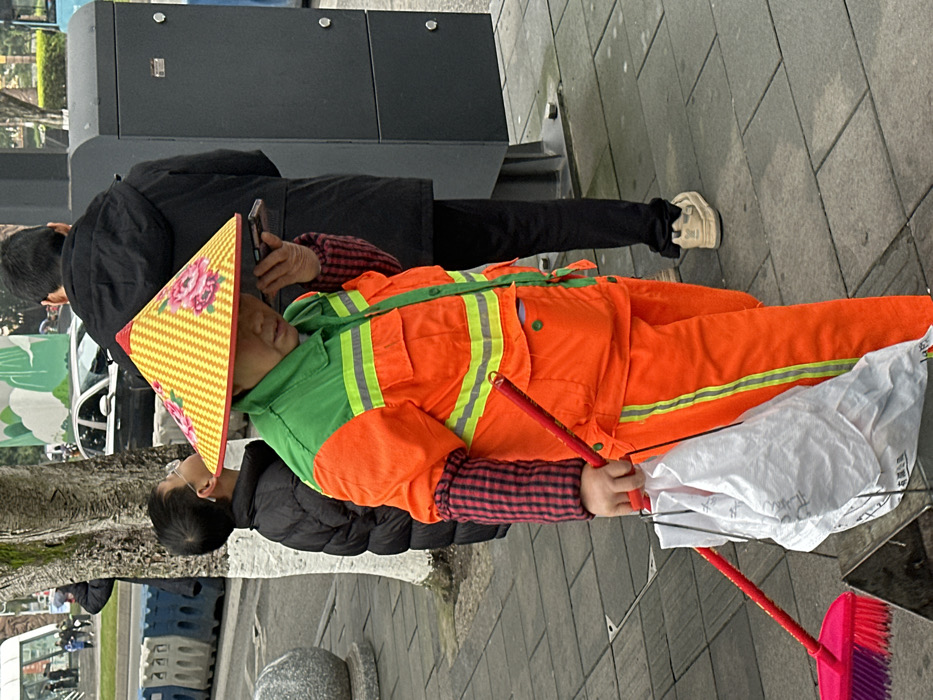 A person in orange and green work clothes, wearing a conical hat with floral designs, is resting. The person is holding a red broom handle and a white bag with writing. Another person, wearing a black jacket and holding a phone, stands nearby. A pink broom is visible on the ground. The scene appears to be on a sidewalk near a street with a building in the background.