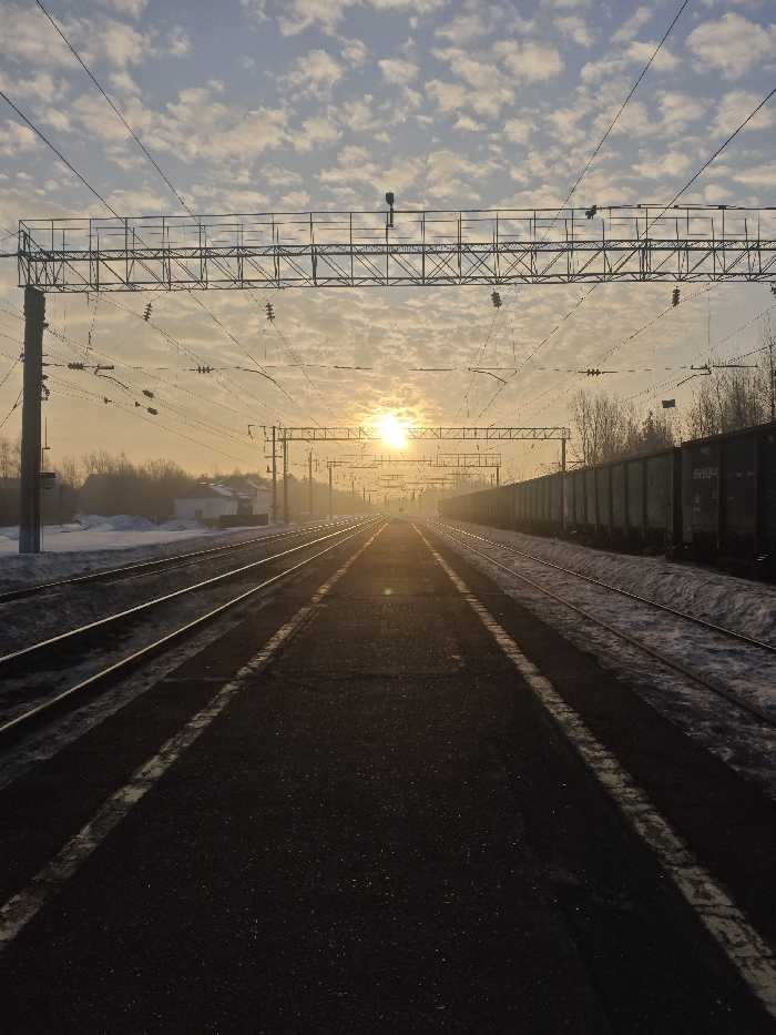- "The image displays a railway station or track area in Kambarka, Russia, during either sunrise or sunset, characterized by a low, bright golden sun positioned centrally on the horizon, casting a warm glow through a slightly hazy atmosphere" by FM-RB25D3, licensed under CC BY 4.0
