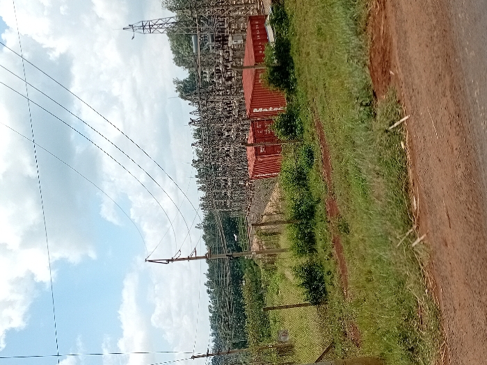 The image displays an outdoor scene of an electrical substation in Mururi, Kenya, under a partially cloudy blue sky
