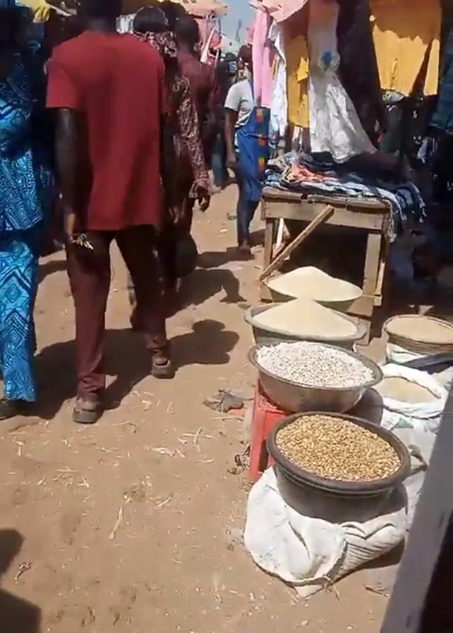 busy marketplace scene, likely in a sunny outdoor setting. The ground appears to be dirt or sand. Numerous people are walking around, wearing a variety of clothing, some traditional and some casual. There are stalls and vendors selling goods, including what appears to be grains or seeds displayed in metal bowls. A person is carrying a large sack. Overall, it seems like a typical day at a bustling market.