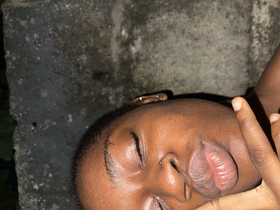 person with dark skin lying down with their eyes closed. The person has a nose piercing and is holding their hand up to their face. The background is a gray, rough surface that appears to be a wall or concrete structure. The lighting is dim.