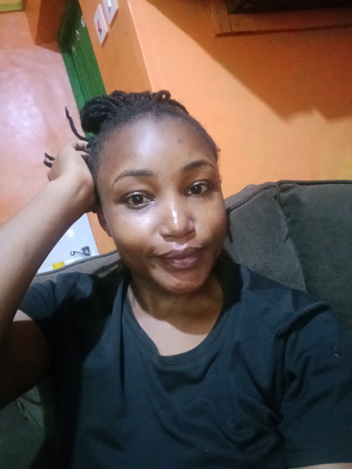 A dark-skinned woman is posing in front of an orange wall. She's wearing a dark t-shirt and has her hair styled in braids. Her right hand is resting on her head. The background includes a glimpse of a green door and a dark couch, creating a casual indoor setting. The lighting is warm.