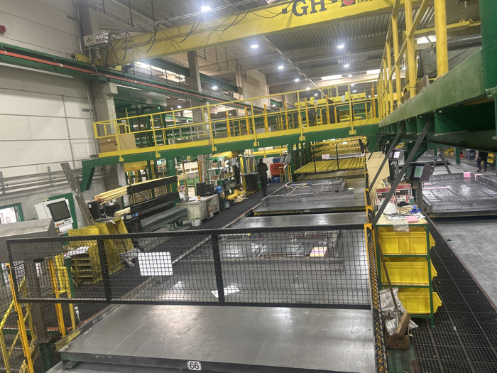 This image depicts a large industrial manufacturing facility, located in Amsterdam, Netherlands. The scene is observed from an elevated perspective, looking across a spacious factory floor illuminated by overhead lighting. The environment features a high ceiling with a prominent yellow overhead gantry crane spanning the width of the facility, bearing the marking "GH10T VAN." Structural elements and walkways are predominantly green and yellow. The floor surface appears to be concrete, with various gridded metal walkways integrated into the setup. In the foreground, a black metal mesh railing separates the viewer from a large, flat, gray platform labeled with the number "66." To the right of this platform, a green and yellow shelving unit holds three yellow bins. The central area of the facility is occupied by multiple large, rectangular work platforms or tables arranged in rows. Several of these platforms contain what appear to be molds or forms, some featuring embedded reinforcing elements resembling rebar. A horizontal conveyor system or automated transport line is visible running through the mid-ground. Various workstations, including computer monitors and control panels, are present throughout the work areas. Stacks of elongated materials, possibly metal bars or wood, are visible on a platform to the left. Two individuals, dressed in dark work attire, are present on the factory floor in the middle ground, appearing to be engaged in work-related movement. One individual is partially visible walking towards the right side of the frame, while another is further right and partially obscured by machinery. No specific interactions between individuals are discernible. The overall scene suggests an active production environment involving fabrication or assembly of large components.