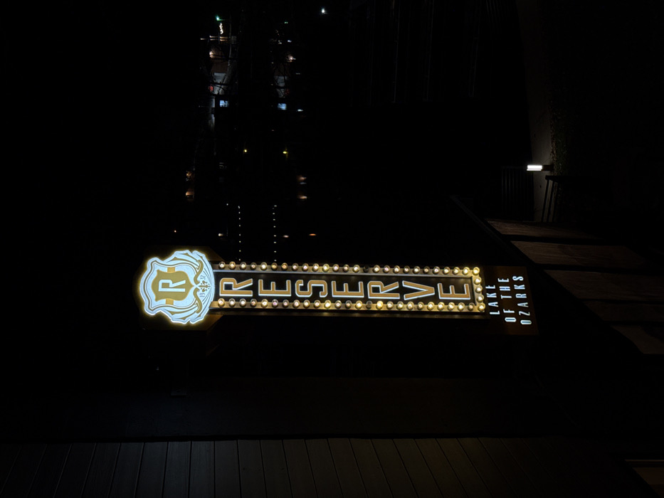 A horizontally oriented sign reads "RESERVE LAKE OF THE OZARKS," illuminated with numerous small, round bulbs