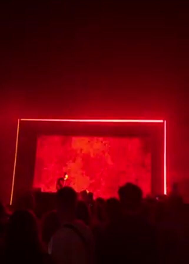 concert stage illuminated with red light. A screen with red abstract patterns is centered on the stage, surrounded by a rectangular light frame. A figure stands in front of the screen. A crowd of people faces the stage, with some holding up their phones. The lighting changes throughout the video, with light beams moving around the stage.