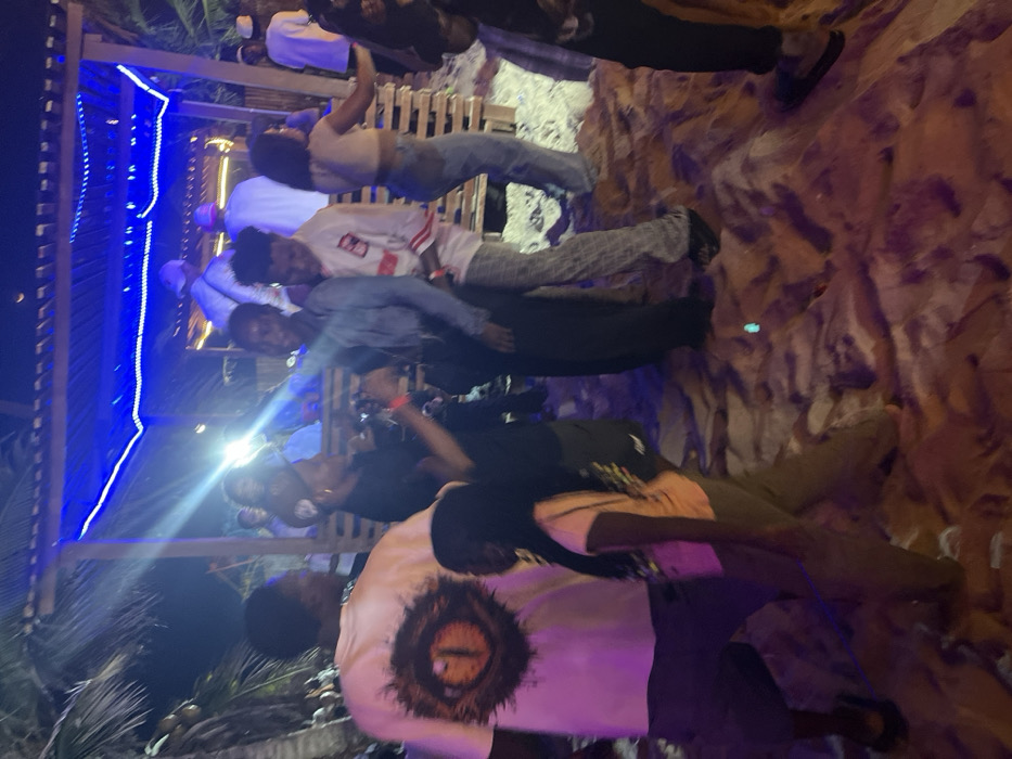 A group of people are gathered outside, likely at a party or social event. They are standing on a structure possibly made of wood. Blue lights adorn the structure. Most of the individuals are in casual clothing. Some are standing, while others are leaning against the structure. The background is a combination of natural elements like palm trees and constructed features like a textured wall.
