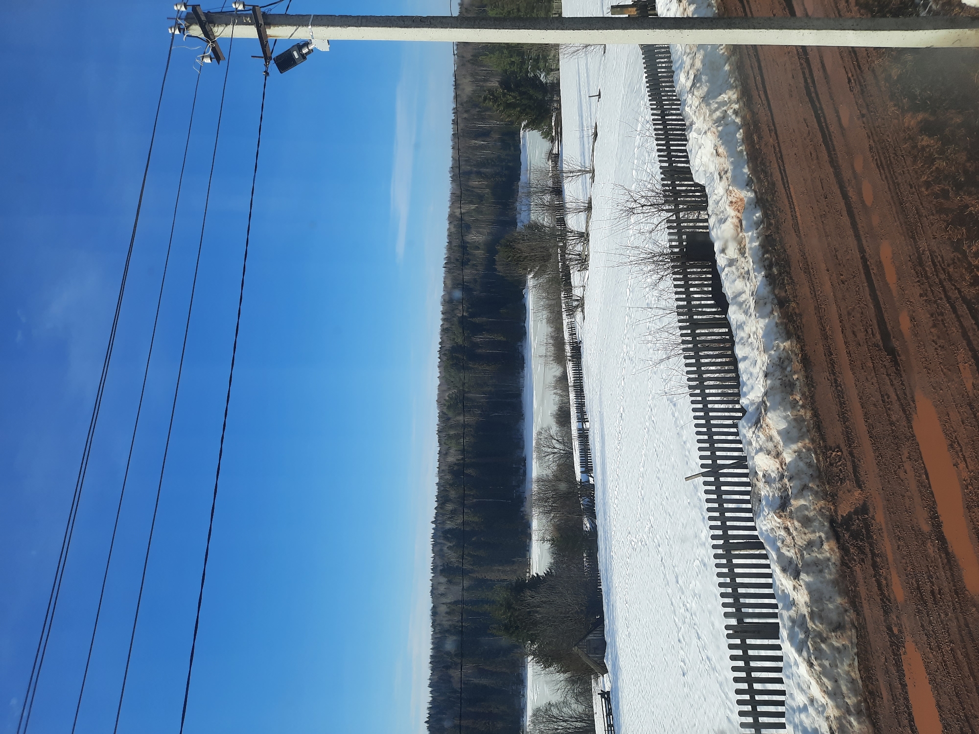 The image depicts a winter or early spring landscape in Архангельское, Russia, under a clear blue sky. In the immediate foreground, a reddish-brown dirt road with visible tire tracks and small puddles runs horizontally. Adjacent to the road, a dirty snowbank with embedded soil is present, behind which a dark wooden picket fence extends from left to right. Beyond the fence, a vast field covered in white snow is visible, dotted with several leafless deciduous shrubs and small trees. To the left, a small, dark wooden structure with a sloped roof is partially visible amidst the vegetation. Further in the background, a body of water, partially covered in ice and snow, stretches horizontally. Beyond the frozen water, a dense forest of coniferous and deciduous trees forms the distant horizon. On the right side of the frame, a concrete utility pole is partially visible, featuring multiple power lines extending horizontally across the sky and an attached LED street light fixture. No individuals or active subjects are present in the scene. The lighting suggests a bright, sunny day.