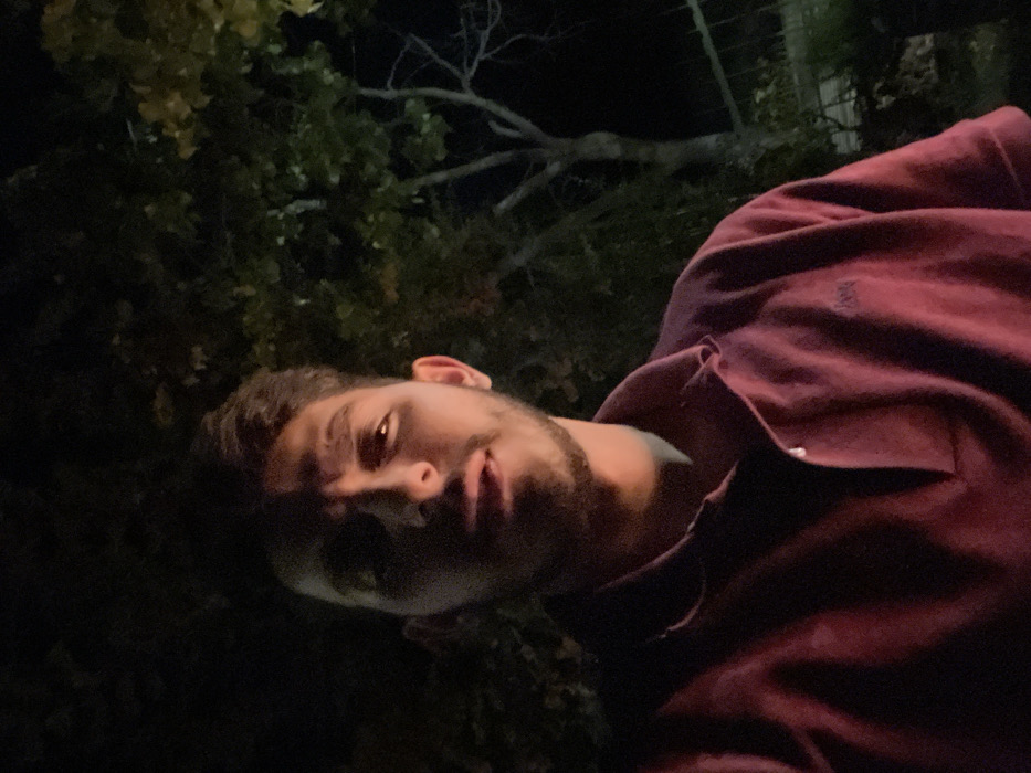 A low-angle shot shows a man with dark hair and a beard wearing a burgundy collared shirt. His face is illuminated, highlighting his eyes, nose, and mouth. The background is dark with glimpses of tree branches and foliage. The lighting is dim, contributing to the overall shadowy ambiance. The photograph is rotated, giving a tilted perspective of the subject and the surroundings.