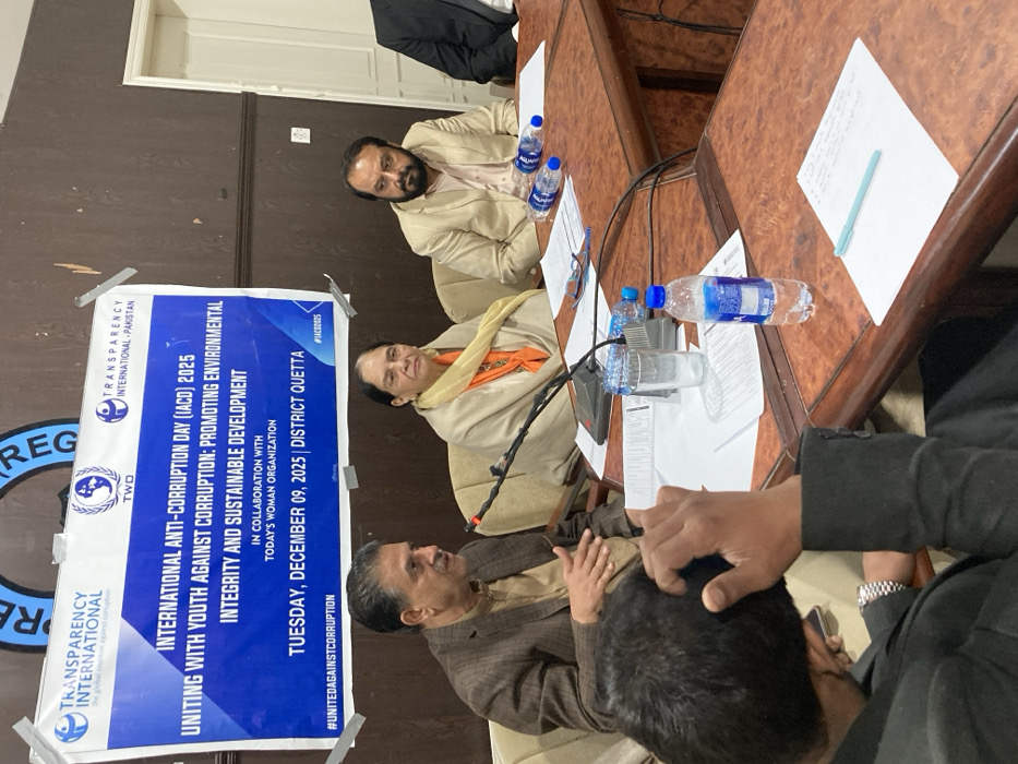 The image displays an indoor meeting or conference situated in Quetta City Tehsil, Pakistan. A large blue banner, featuring white text and logos for "Transparency International" and "Today's Woman Organization" (TWO), is taped to a light-colored wall in the background. The banner announces "INTERNATIONAL ANTI-CORRUPTION DAY (IACD) 2025," with the theme "UNITING WITH YOUTH AGAINST CORRUPTION: PROMOTING ENVIRONMENTAL INTEGRITY AND SUSTAINABLE DEVELOPMENT," in collaboration with Today's Woman Organization, scheduled for "TUESDAY, DECEMBER 09, 2025 | DISTRICT QUETTA." Five individuals are present around a dark brown, polished wooden conference table. In the mid-ground, an adult male with a mustache, wearing a brown patterned jacket over a light shirt, is speaking while gesturing with his left hand. A gooseneck microphone is positioned in front of him. To his right sits an adult female, dressed in a light beige shawl over an orange garment, looking directly forward. Next to her is an adult male with a beard, wearing a light beige suit jacket, also looking forward. A partial view of a fourth individual, wearing a dark suit, is visible on the far right. In the foreground, with his back to the viewer, is an adult male with dark hair, dressed in a dark jacket, with his right hand near his head. The table surface holds several plastic water bottles (some identified as Nestle Pure Life), clear drinking glasses, multiple stacks of white papers, a light blue pen, and a pair of eyeglasses. Another gooseneck microphone is visible further down the table to the right. The walls of the room are light-colored, and a white electrical outlet is visible on the right wall section.