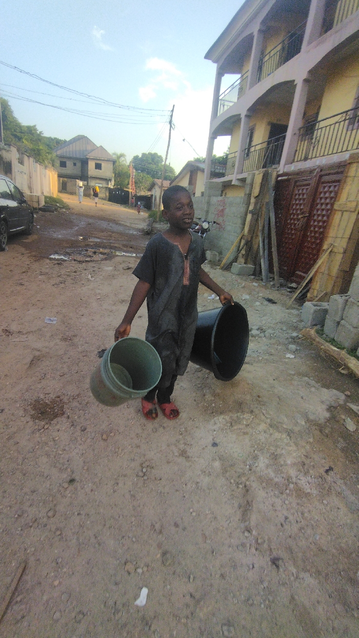 - "A young boy carries a green bucket in his left hand and a larger black bucket in his right, walking on a dirt road" by FM-fHbIm2, licensed under CC BY 4.0