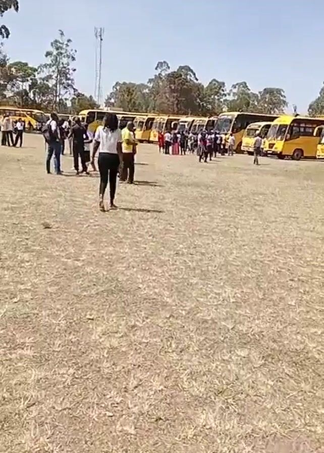 large, grassy field under a blue sky. Several yellow buses are parked in neat rows in the background. The buses all have the word "LWANGA" on them. There are numerous people scattered around the field, walking and standing in small groups. Some individuals are wearing school uniforms. In the foreground, a woman wearing a white shirt and black pants walks away from the camera. A tall antenna tower is visible in the distance.
