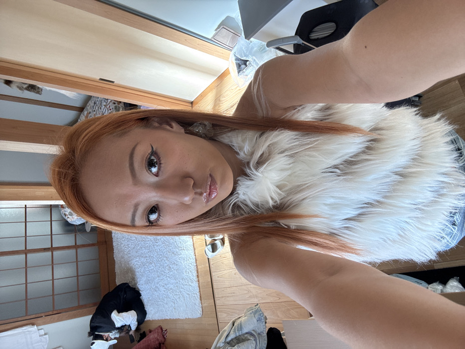 A woman with red hair and winged eyeliner takes a selfie. She wears a furry white vest and translucent earrings. Her lips are glossy. Behind her, there's a white rug on a wooden floor, a black object (possibly a bag) nearby, and what appears to be a window with grid-like patterns. Above, a chair and other items are partially visible. The photo is slightly tilted.