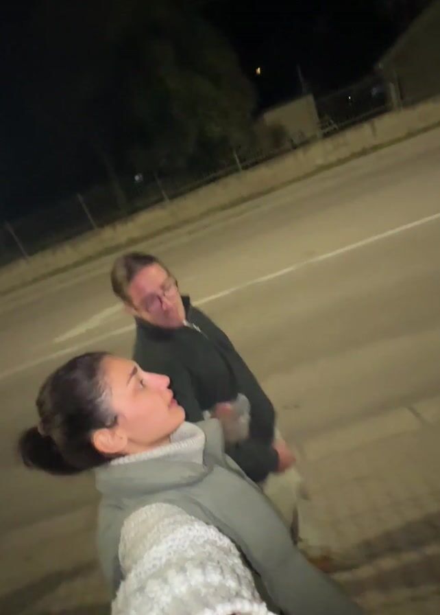 two people walking along a street at night. The person holding the camera appears to be a woman with long brown hair in a ponytail, wearing a gray puffer vest over a white sweater. She looks toward the camera and smiles briefly. Next to her is a man with medium-length brown hair pulled back in a bun, wearing glasses and a dark jacket. He holds what appears to be a plastic cup in his hand. They are walking on the sidewalk next to a street. The lighting is dim. There are buildings and trees visible in the background, but the focus remains on the two people. They appear to be chatting as they walk.