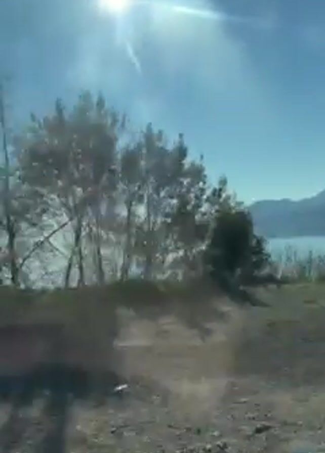 drive along a coastline on a sunny day. The sun is bright and high in the sky. The sea is calm and extends to the horizon, where mountains are visible in the distance. The camera is moving, capturing the view from a vehicle. Vegetation, including tall grasses and leafless trees, lines the roadside. A glimpse of a trailer or small structure is seen near the water's edge. The road appears to be unpaved and covered in gravel. Music plays in the background.