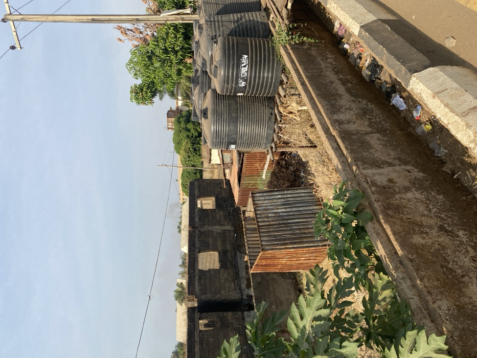 The image depicts an outdoor scene in Maigizo, Nigeria, under a clear, pale blue sky. In the foreground, a concrete drainage ditch, partially filled with litter including plastic bottles and bags, runs parallel to a paved surface (road) on the far right. Adjacent to the ditch on the left, green foliage, including large papaya-like leaves and smaller shrubs, is visible. In the midground, a cluster of approximately eight to ten black plastic water tanks, some branded "SALVIN," are elevated on a rudimentary support structure made of wooden poles and planks, positioned behind the ditch on the right side. To the left of the tanks and further back, an open, dry plot of land features several structures. These include two partially constructed or derelict buildings made of cinder blocks, exhibiting empty window and door frames. Scattered among these structures are multiple rusty corrugated metal objects, including a cube-shaped enclosure and various sheets or smaller shelters. The background shows additional buildings with light-colored roofs, interspersed with green trees. A tall utility pole with electrical lines extends vertically on the right side of the frame. Faint plumes of dark smoke are visible rising in the distant background against the horizon. No individuals are present in the frame.