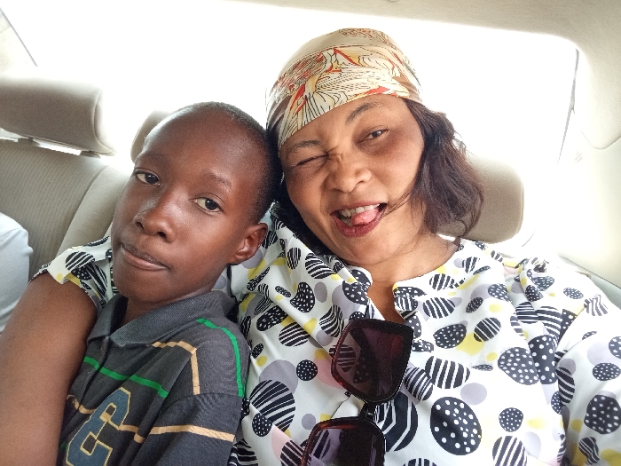 An adult female and a male adolescent are depicted in a selfie-style photograph taken inside a vehicle