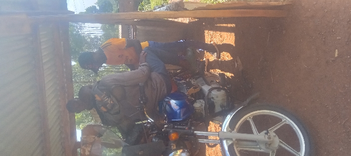 A daylight scene in Getenga ward, Kenya, depicts three adult males and a motorcycle beneath a lean-to shelter