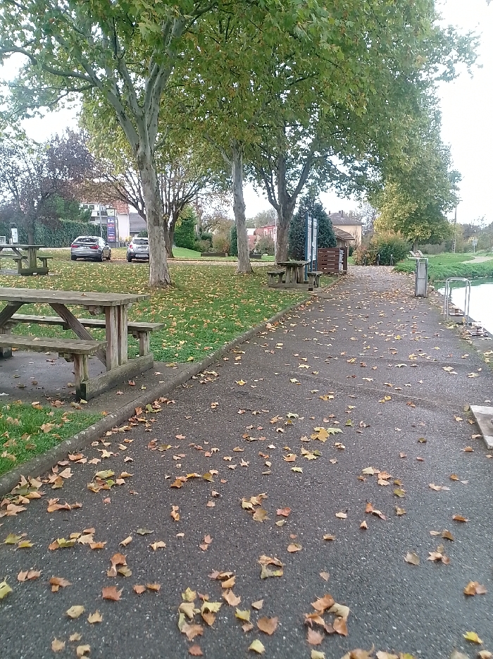 The image depicts an outdoor recreational area adjacent to a canal in Souffelweyersheim, France, under overcast conditions, consistent with autumn. An asphalt pathway, heavily covered with scattered dry, multi-colored (yellow, orange, brown) fallen leaves, runs from the bottom center towards the background along the right side of the frame. A concrete curb delineates the pathway from a grassy area to its left. On this grassy area, several large deciduous trees with light-colored, mottled bark and green-to-yellowing foliage are present. Three wooden picnic tables with integrated benches are positioned on the grass; one is prominent in the lower left foreground, a second is further back near the center-left, and a third is visible towards the right edge of the grassy expanse. In the mid-background, two parked passenger vehicles—a light-colored SUV and a dark sedan—are visible on an unpaved surface beyond the trees. Residential buildings with red-tiled roofs are discernible in the distant background. To the far right, a body of water, consistent with a canal, is visible, bordered by a metal safety railing and a light-colored bank structure. A grey metal utility post or bollard stands near the water's edge. No individuals are present, and no active interactions are depicted.
