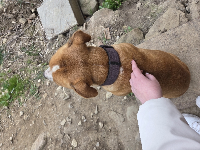 - "An overhead view depicts a medium-sized, reddish-brown dog with a distinct white patch on its head and a dark grey collar, sitting on unpaved, rocky terrain" by FM-8Olo43, licensed under CC BY 4.0