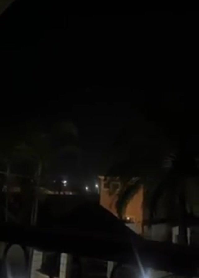 night view from a balcony. The sky is dark and mostly obscured by trees and buildings. Palm trees and other foliage are visible in silhouette. There are faint lights in the distance indicating buildings or street lamps. The balcony railing is visible in the foreground, suggesting a residential setting. The scene is still and quiet, with no obvious movement or sound.