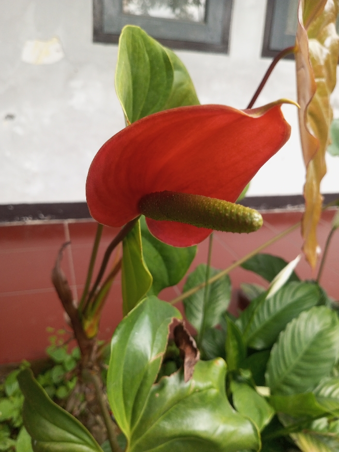 A close-up, mid-level view depicts a red Anthurium flower with a green, textured spadix, positioned towards the center-right of the frame. The flower's spathe is a solid red color. Surrounding the primary flower are multiple green leaves of varying sizes, some exhibiting minor browning or damage along their edges. Darker plant stems are visible among the foliage. The background consists of two distinct horizontal sections: an upper section featuring a light-colored, possibly white, wall with a partial dark-framed window or opening visible, and a lower section presenting a uniform reddish-brown surface, likely a tiled wall base or planter. The scene is located in Ciherang, Indonesia. No human subjects, animals, or discernible actions are present.