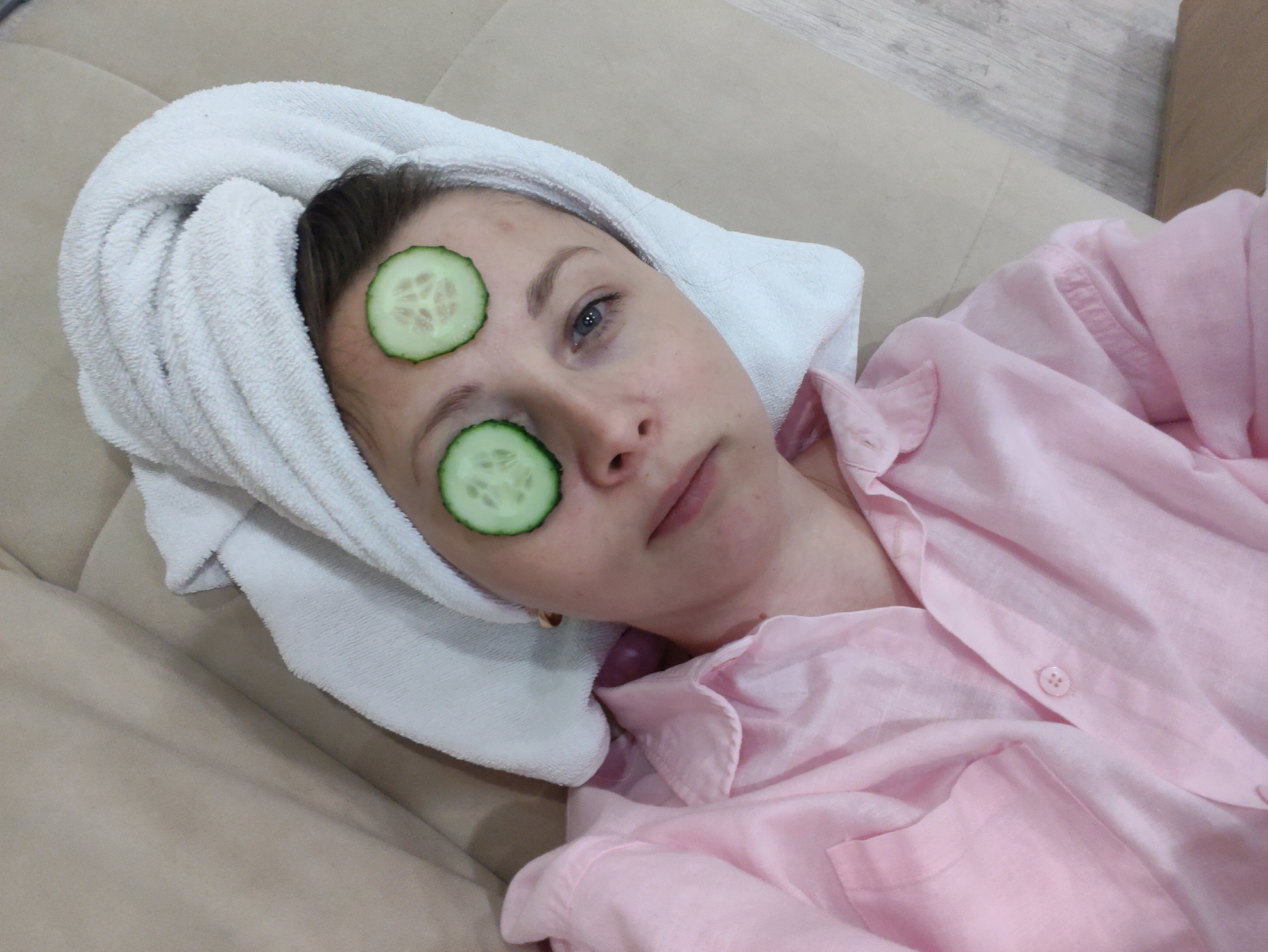 A woman is lying on a light brown sofa, wearing a pink shirt and a white towel wrapped around her head. She has cucumber slices over her eyes and on her forehead. The location is indoors, potentially a home environment.