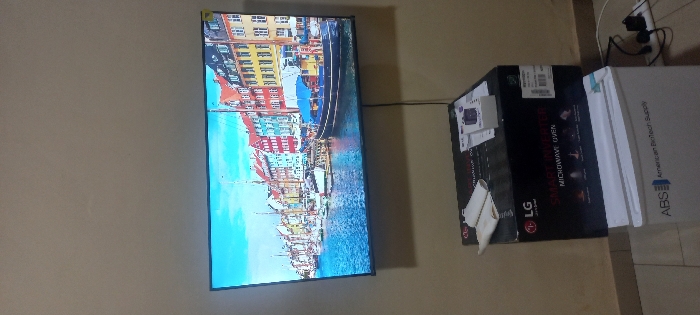 The image displays an indoor scene in Nibo, Nigeria. A flat-screen television is mounted on a light-colored wall, displaying a colorful image of a European-style waterfront with multi-hued buildings, boats docked in water, and a blue sky. An electrical cable descends from the television. Directly below the television, a black LG "SMART INVERTER MICROWAVE OVEN" box sits on a white "ABS American Biotech Supply" compact refrigerator. White packaging material and a small white box are present on top of the microwave oven box. To the right of the refrigerator, on the light-tiled floor, a white power strip is visible with electrical plugs inserted. No individuals are present.