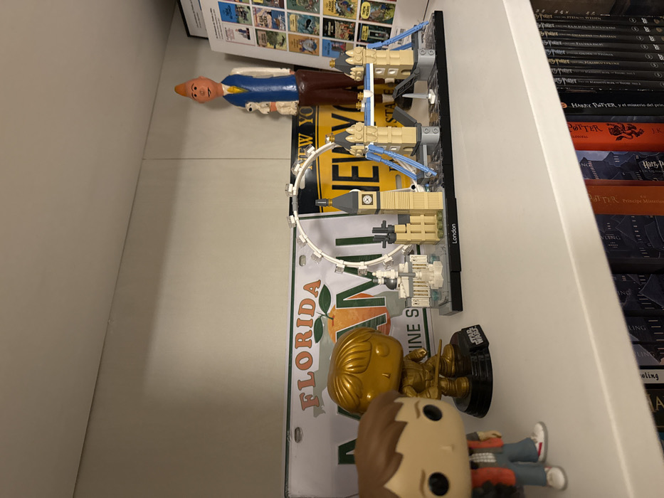 The image displays a white shelf in an interior setting within Cascais, Portugal. The shelf holds an assortment of collectible figures and decorative objects against a light-colored wall. On the left, a Funko Pop figure, appearing as Marty McFly in a red vest and blue jeans, is partially visible. Next to it, a golden Funko Pop figure, resembling Harry Potter holding a wand, rests on a black base marked "STAR WARS". Behind these figures, a white Florida license plate with an orange graphic and the text "THE SUNSHINE STATE" is mounted, partially obscuring a yellow sign with "NEW YO" visible. The central arrangement consists of a Lego Architecture set depicting London landmarks, placed on a black base labeled "London". This set includes models of Trafalgar Square/Nelson's Column, the London Eye, Big Ben (Elizabeth Tower), and Tower Bridge with blue structural elements. To the far right, a tall figurine resembling Tintin, characterized by orange hair, a yellow shirt, and a blue vest, holds a small white dog (Snowy). Behind this figurine, a white sheet or poster displaying multiple comic book covers is visible. The shelf below holds numerous books, with visible spines suggesting titles from the "Harry Potter" series. All items are static and arranged for display.