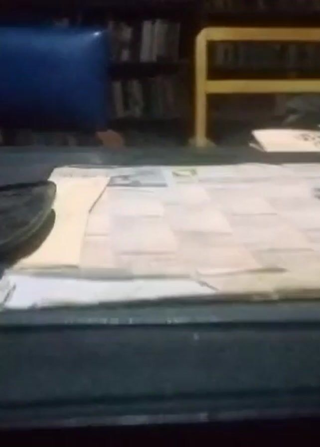 The video pans quickly across a cluttered workspace with a black table top. On the table are newspaper pages, a green pen, a blue ruler, a small black object, and other unidentified items. In the background is a bookshelf filled with books and other objects, a yellow chair, and a blue cushion. The lighting is dim. The camera movement is unsteady and shaky.