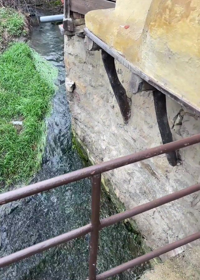 The camera pans along a stone building next to a narrow, rapidly flowing stream. On the water's edge, there is lush green grass. The building is supported by wooden beams, and its exterior is painted a light yellow. Next to a dark wooden door are two potted plants, and a rusty metal railing runs along the edge of a walkway, separating it from the stream below. The water is dark and turbulent, reflecting the sky.