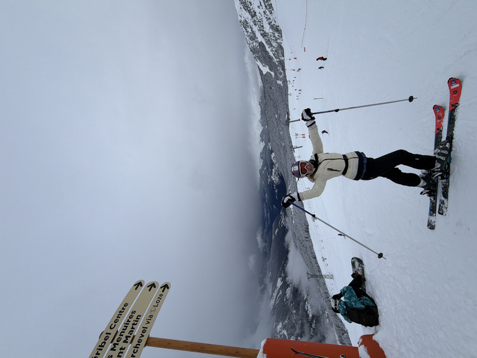The image displays a snow-covered mountain ski slope in the French Alps, within the commune of Les Allues, France. A female skier, positioned centrally in the foreground, stands on skis, facing the camera with a smile and her arms raised, holding ski poles. She wears a white puffer-style ski jacket, black ski pants, a purple helmet, and orange-tinted ski goggles. Her skis are primarily black with red and white accents. To her left, slightly further up the slope, a second individual is seated on a snowboard, wearing a teal and black jacket. In the far left foreground, a wooden signpost with three directional arrows indicates "Méribel Centre," "Les Menuires," "St Martin," and "Courchevel via Loze." The background reveals a vast mountain landscape covered in snow and pine trees, with a valley partially obscured by heavy, low-lying gray clouds. Ski lift infrastructure, including pylons, is visible on the slopes. Several other indistinct skiers are present further down the slope. The sky is uniformly overcast.