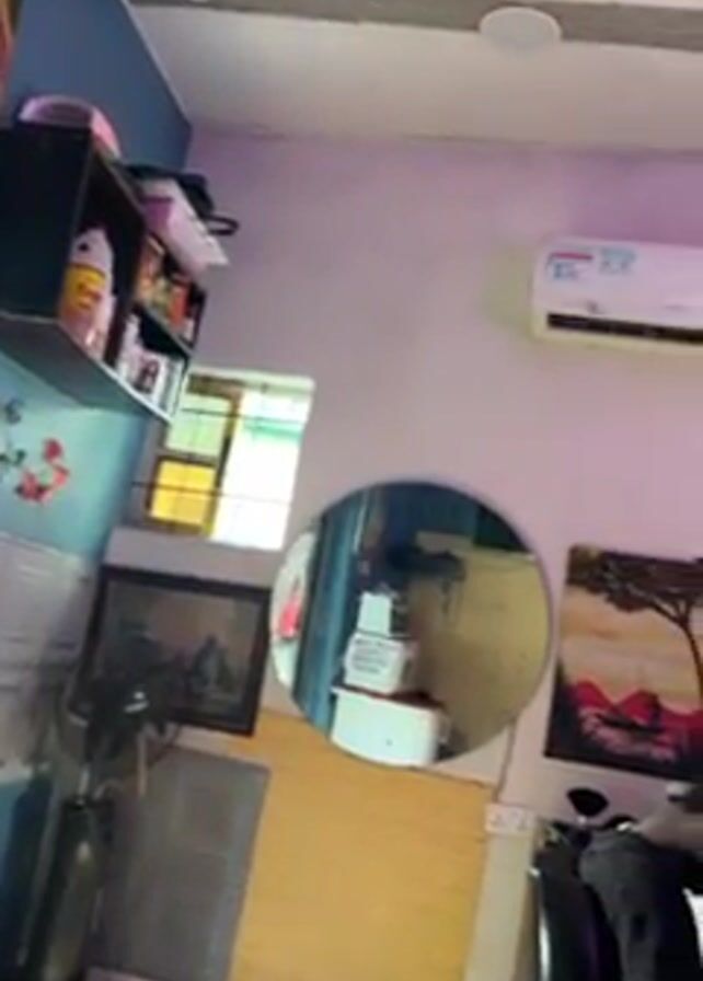 portion of a room, possibly a barbershop, with a white ceiling and walls. The walls are decorated with various paintings, a round mirror, and a pink neon sign that reads "Sorry". An air conditioning unit is mounted on one wall. Two men are present, both wearing glasses. One man is seated, looking at his phone. The room is lit with a mix of natural light from a window and artificial light from ceiling fixtures and a ring light. Other objects in the room include shelves stocked with various items, a standing fan, and barbering supplies. The camera pans slightly to show more of the room. The video appears to be taken indoors.