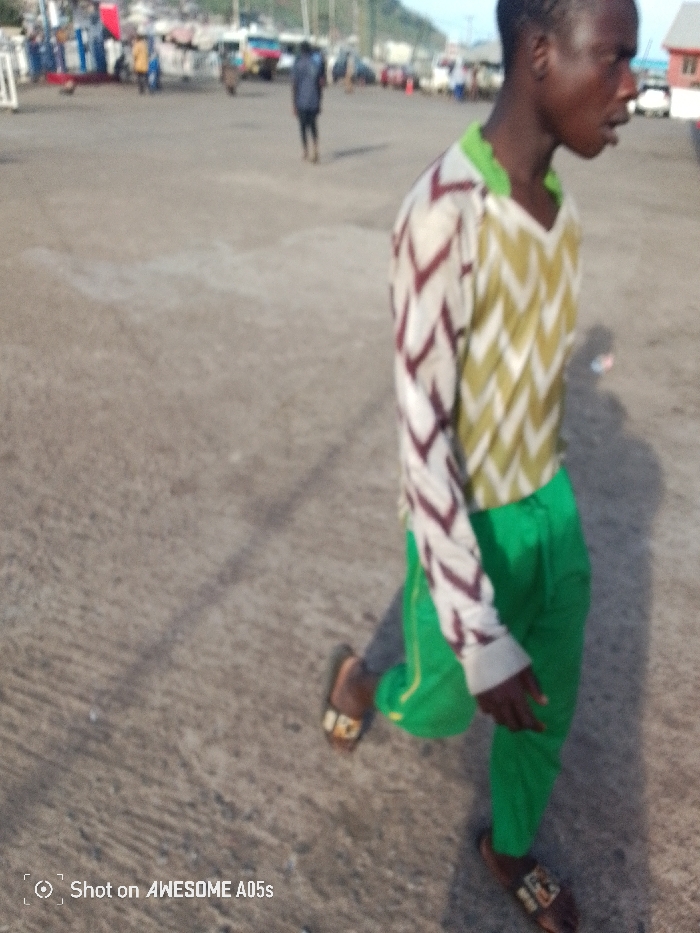 An outdoor daytime scene in Lokoja, Nigeria, depicts an expansive open-air area, consistent with a market or transportation hub. The primary subject, a young Black male, estimated to be in his late teens or early twenties, occupies the mid-ground, moving rightward in profile. He wears a long-sleeved shirt with a green collar, featuring a dual chevron pattern: maroon on an off-white background on the left side, and olive on an off-white background on the right side. He is dressed in bright green athletic-style pants and brown slip-on sandals with decorative accents. His posture indicates forward movement, with his right foot slightly elevated. A distinct shadow extends behind him to his right. The ground surface is light gray and appears unpaved. The blurred background contains several additional individuals, assorted vehicles including a large van or bus, and multiple indistinct structures, notably a red and white building. A natural hill or elevated terrain is visible in the far distance beneath a bright sky. A "Shot on AWESOME A05s" watermark is present in the lower-left corner.