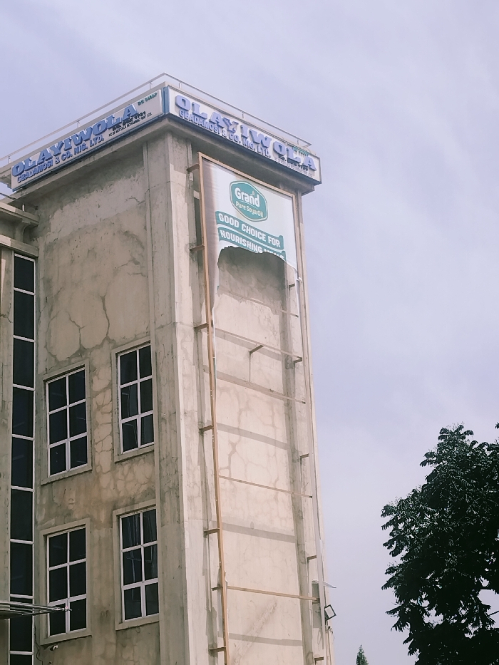 building with the name "OLAYIWOLA" written on the side. The building is located in Jos, Nigeria at the coordinates 9.91 latitude and 8.894 longitude. It is a concrete building with a large billboard featuring an advertisement for "Grand Pure Soya Oil," which is partially torn. The billboard reads "GOOD CHOICE FOR NOURISHING." There is a wooden scaffolding structure on the side of the building. The building has several windows and appears to be under construction. There is a tree on the right side of the image, partially visible. The sky is overcast.