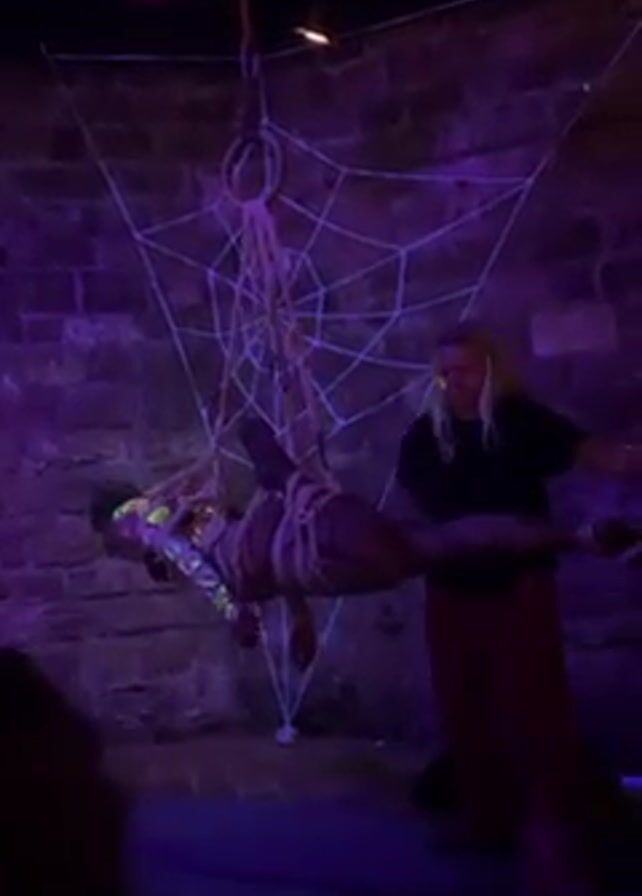 A performer with UV-reactive paint on their face hangs suspended upside down by ropes tied to a ring and a web of string. Another person stands behind the performer, appearing to adjust their position or the ropes. The setting appears to be a stage or performance space with a brick wall in the background and a purple light illuminating the scene. The camera is focused on the performer and the other person on stage, with a blurry figure of the audience visible in the foreground.