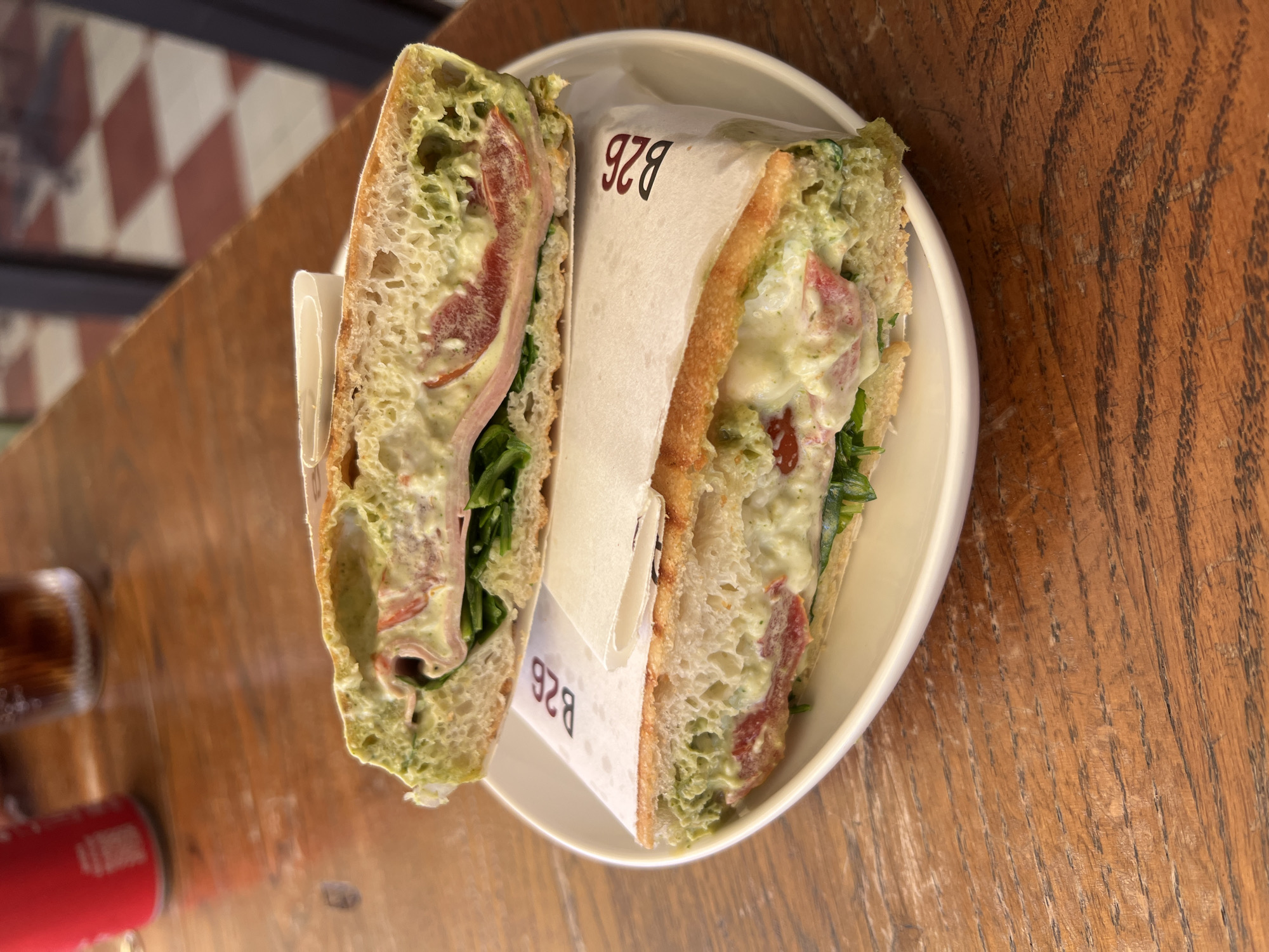 A halved sandwich sits on a white plate on a wooden table. The sandwich is filled with greens, ham, tomatoes, and a creamy green sauce. A paper wrapper with the text "B2B" is partially wrapped around the sandwich. A red and white can is visible in the lower left corner of the image. The floor has a red and white checkered pattern. The scene is likely in Nha Trang, Vietnam, based on the "B2B" brand.