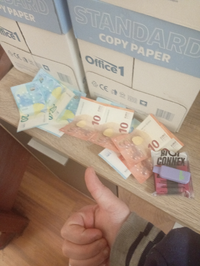 The image depicts an overhead view of a light-brown wood-grain surface, likely a desk or shelf, in what appears to be an office or home office setting in Sofia, Bulgaria. This location is inferred from the visible "Office1" branding on copy paper boxes, as Office 1 Superstore is a prominent Bulgarian office supply chain. In the lower right and center, a human left hand is performing a "thumbs up" gesture. The hand's wrist is partially covered by a long-sleeved garment featuring horizontal stripes. Scattered across the wood-grain surface are various objects. To the left, several crumpled or partially folded 20 Euro banknotes are visible. Towards the center-right, multiple 10 Euro banknotes are interspersed with at least three transparent blister packs containing numerous small, round, yellow pills or tablets. A small, folded white paper packet or leaflet is also present near these items. To the far right of the surface, a transparent plastic package contains multiple dark-colored markers or pens, one with a green cap and a purple clip. The brand "HACK CONNEX" is partially visible in black text on this package. In the background, two stacked cardboard boxes are visible. The boxes are white with light blue text, clearly labeled "STANDARD COPY PAPER" and bearing the "Office1" logo. Other markings, including "CE" symbols, are also present on the boxes. The flooring visible in the lower-left corner is a matching light-brown wood-grain pattern.