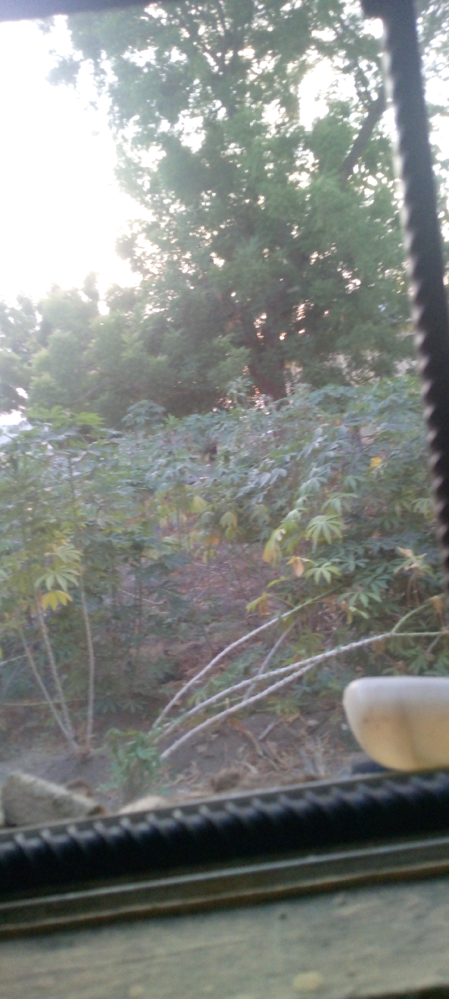 The scene depicts an outdoor view from within Adankolo, Nigeria, observed through what appears to be a window or opening. The immediate foreground, largely out of focus, features a dark, ribbed horizontal bar, likely a window frame or rebar, extending across the lower portion of the image. To the right, a smooth, light-colored, amorphous object is partially visible. The midground consists of dense, green foliage, dominated by plants with distinctive palmate leaves and slender stems, consistent with young cassava plants (Manihot esculenta). Several lighter-colored, bare branches are visible among this vegetation. The ground beneath the foliage appears to be dry earth with sparse debris. In the background, taller, dark green trees are present, partially silhouetted against a bright, diffused light source originating from the upper left quadrant, suggesting either dawn or dusk. No individuals, explicit actions, or interactions are discernible within the frame.