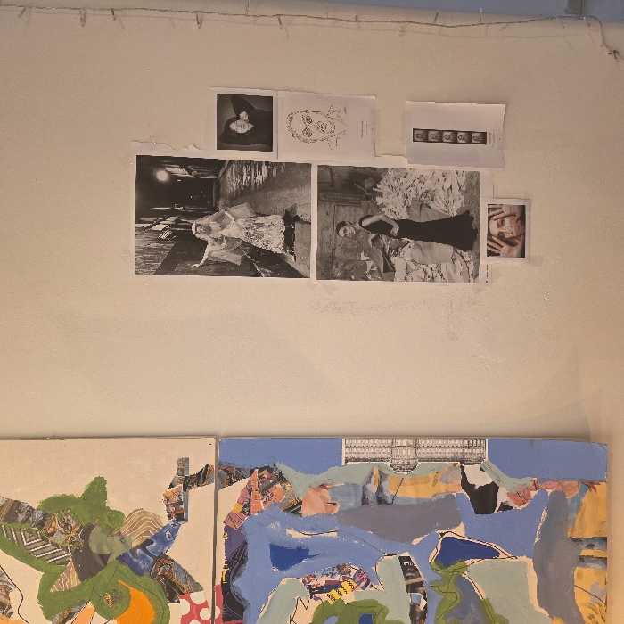 The scene depicts an interior wall in Haifa, Israel, displaying a collection of artworks and photographs. On the left, two vertically stacked rectangular mixed-media collages are present. The upper collage features abstract shapes in green, orange, blue, and various patterned paper fragments. The lower collage exhibits abstract forms primarily in light blue, dark blue, green, and orange, with visible torn paper elements, including what appears to be an architectural structure on its right edge. On the right side of the wall, seven printed images are affixed. These include two large black and white photographs: the upper one portrays a figure in an ornate white dress and veil standing in a narrow, dimly lit alleyway; the lower one shows a slender individual in a long dark dress amidst scattered debris. Below these is a small color photograph depicting a person's hands framing their eyes and nose. To the right, a small black and white portrait of an individual with dark hair is displayed, situated above a line drawing of a stylized face. The lowest item on the right is a vertical photo booth strip containing four identical portrait images. A string of small, illuminated lights runs vertically along the far right edge of the wall. The wall itself is a plain, light-colored surface.